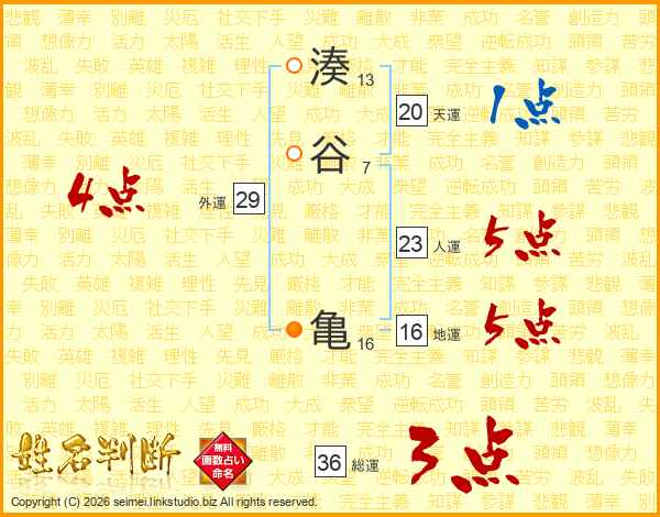 湊谷亀さんの総運は36画の3点!
