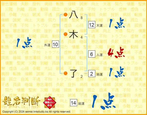 生活面を象徴する運勢です。外部から受ける影響力を表し、結婚運、家庭運や職場、環境への順応性を表します。総運から人運を引いた画数。姓や名が1文字の場合を除く。
