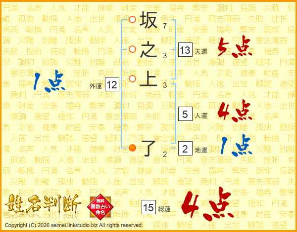 生活面を象徴する運勢です。外部から受ける影響力を表し、結婚運、家庭運や職場、環境への順応性を表します。総運から人運を引いた画数。姓や名が1文字の場合を除く。