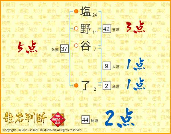 塩野谷了さんの総運は44画の2点!