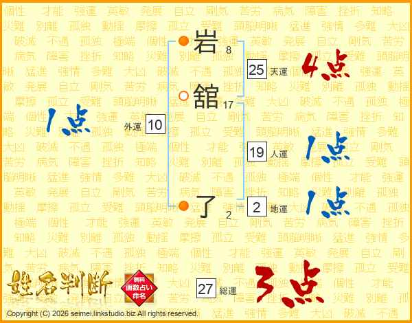 生活面を象徴する運勢です。外部から受ける影響力を表し、結婚運、家庭運や職場、環境への順応性を表します。総運から人運を引いた画数。姓や名が1文字の場合を除く。