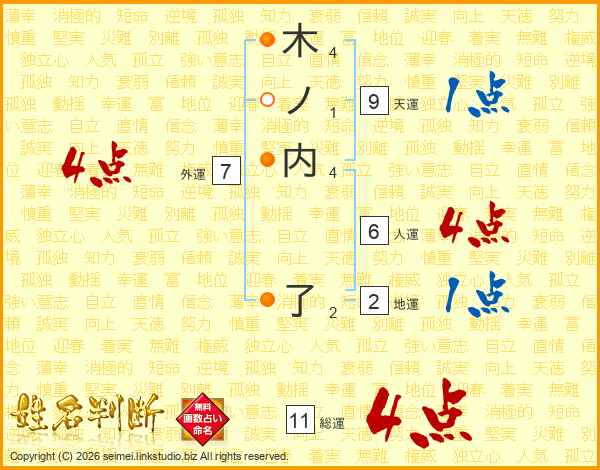 生活面を象徴する運勢です。外部から受ける影響力を表し、結婚運、家庭運や職場、環境への順応性を表します。総運から人運を引いた画数。姓や名が1文字の場合を除く。