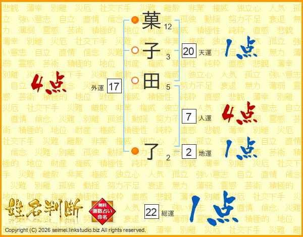 菓子田了さんの総運は22画の1点!