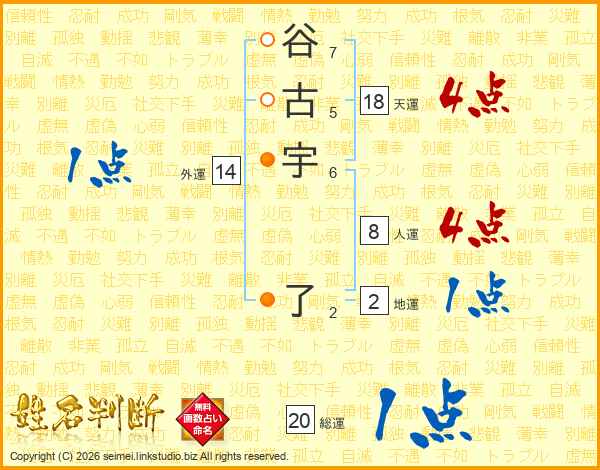 生活面を象徴する運勢です。外部から受ける影響力を表し、結婚運、家庭運や職場、環境への順応性を表します。総運から人運を引いた画数。姓や名が1文字の場合を除く。