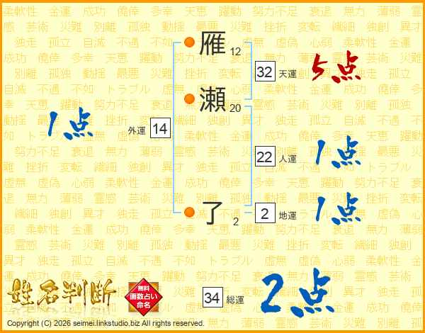 雁瀬了さんの天運は32画の5点!