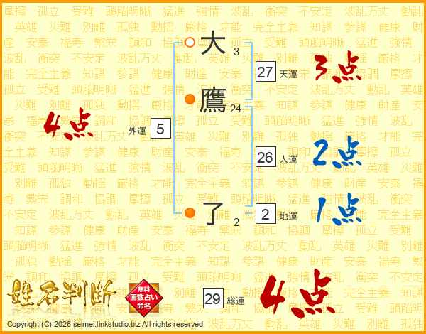 あなたの人生を表す1番重要な運勢です。生涯を通じて影響する総合運となり、主に50歳以降の晩年期に影響を及ぼします。苗字と名前の合計画数。
