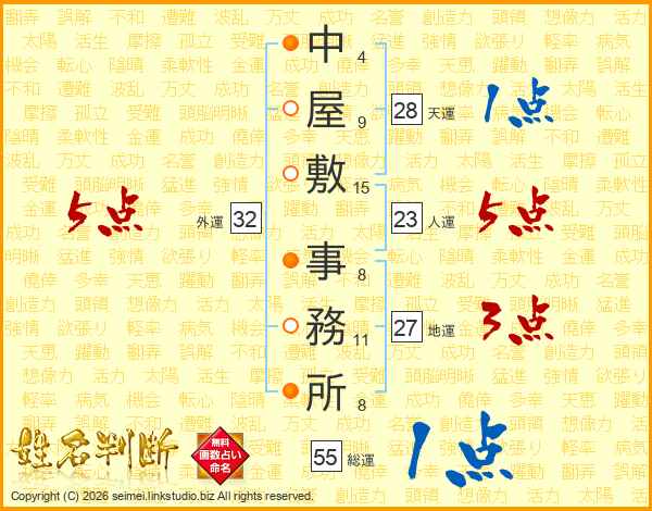 中(4画)屋(9画)敷(15画) 事(8画)務(11画)所(8画)