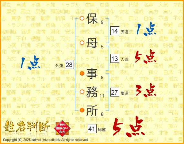 保(9画)母(5画) 事(8画)務(11画)所(8画)