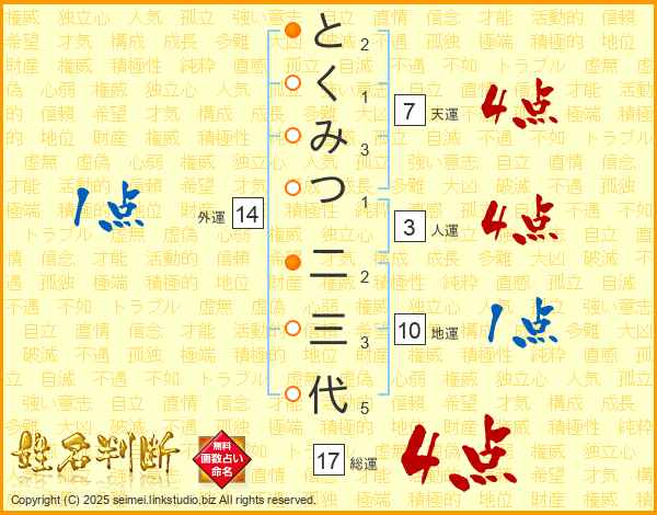 生活面を象徴する運勢です。外部から受ける影響力を表し、結婚運、家庭運や職場、環境への順応性を表します。総運から人運を引いた画数。姓や名が1文字の場合を除く。