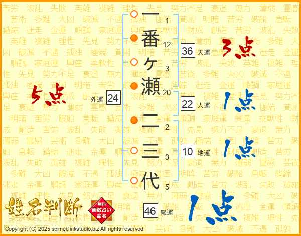 一番ヶ瀬二三代さんの外運は24画の5点!
