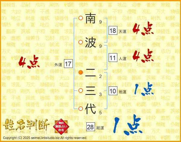 生活面を象徴する運勢です。外部から受ける影響力を表し、結婚運、家庭運や職場、環境への順応性を表します。総運から人運を引いた画数。姓や名が1文字の場合を除く。