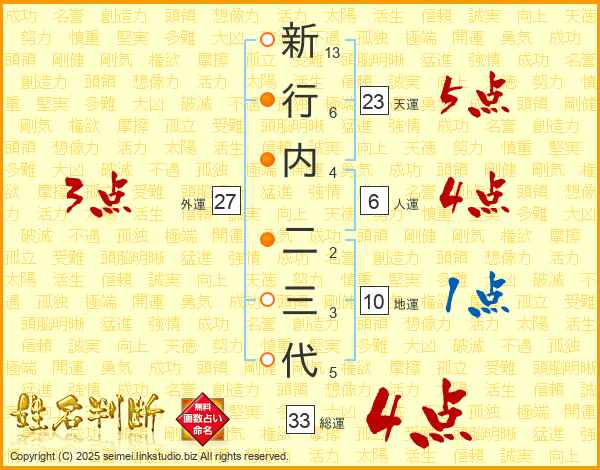生活面を象徴する運勢です。外部から受ける影響力を表し、結婚運、家庭運や職場、環境への順応性を表します。総運から人運を引いた画数。姓や名が1文字の場合を除く。