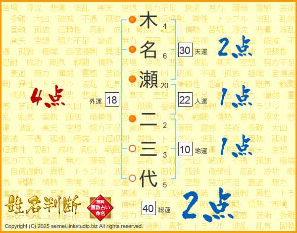 木(4画)名(6画)瀬(20画) 二(2画)三(3画)代(5画)