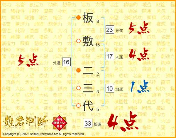 生活面を象徴する運勢です。外部から受ける影響力を表し、結婚運、家庭運や職場、環境への順応性を表します。総運から人運を引いた画数。姓や名が1文字の場合を除く。