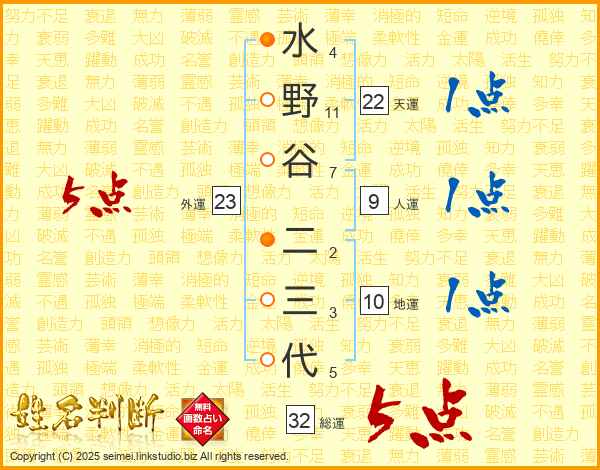 生活面を象徴する運勢です。外部から受ける影響力を表し、結婚運、家庭運や職場、環境への順応性を表します。総運から人運を引いた画数。姓や名が1文字の場合を除く。