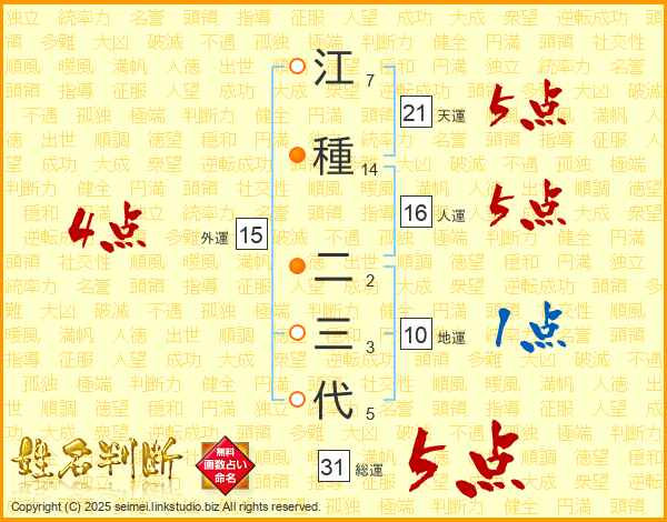 江(7画)種(14画) 二(2画)三(3画)代(5画)