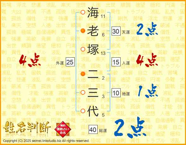 海(11画)老(6画)塚(13画) 二(2画)三(3画)代(5画)