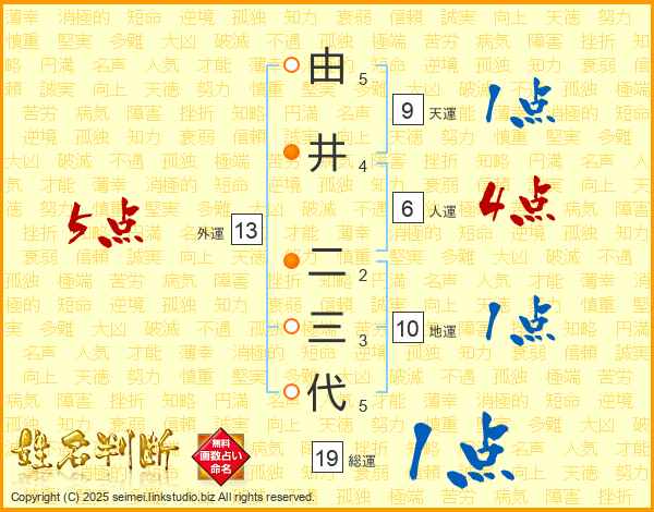 生活面を象徴する運勢です。外部から受ける影響力を表し、結婚運、家庭運や職場、環境への順応性を表します。総運から人運を引いた画数。姓や名が1文字の場合を除く。