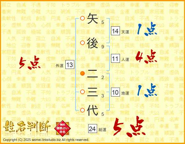生活面を象徴する運勢です。外部から受ける影響力を表し、結婚運、家庭運や職場、環境への順応性を表します。総運から人運を引いた画数。姓や名が1文字の場合を除く。