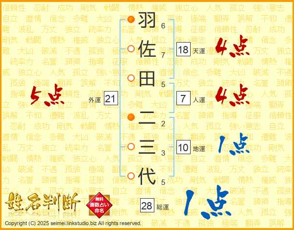 羽(6画)佐(7画)田(5画) 二(2画)三(3画)代(5画)