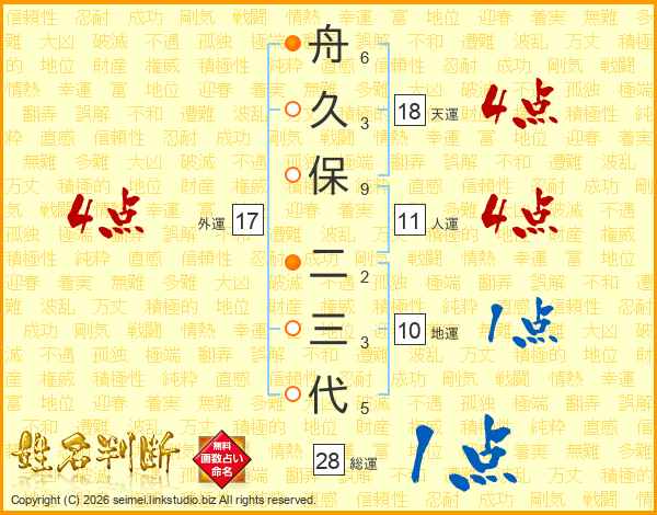 あなたの人生を表す1番重要な運勢です。生涯を通じて影響する総合運となり、主に50歳以降の晩年期に影響を及ぼします。苗字と名前の合計画数。