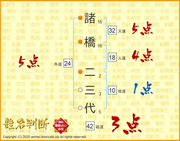 諸(16画)橋(16画) 二(2画)三(3画)代(5画)