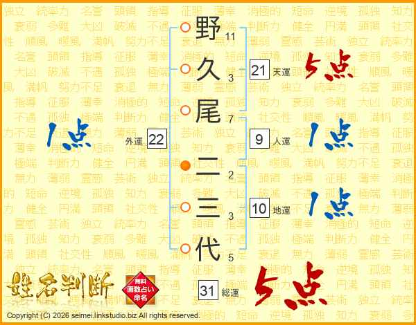 生活面を象徴する運勢です。外部から受ける影響力を表し、結婚運、家庭運や職場、環境への順応性を表します。総運から人運を引いた画数。姓や名が1文字の場合を除く。