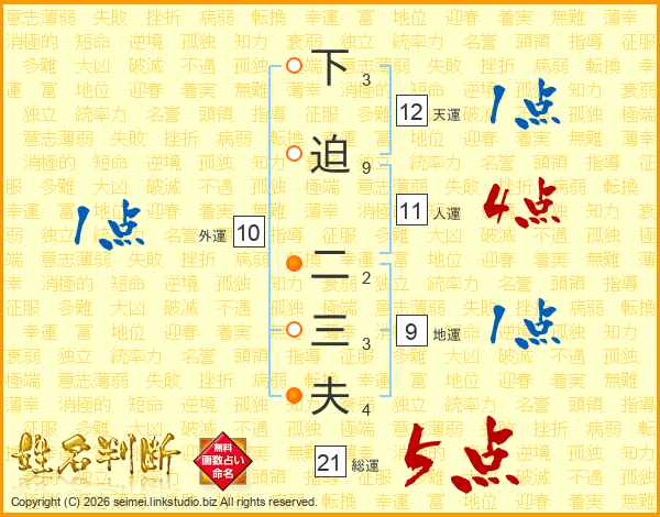 生活面を象徴する運勢です。外部から受ける影響力を表し、結婚運、家庭運や職場、環境への順応性を表します。総運から人運を引いた画数。姓や名が1文字の場合を除く。