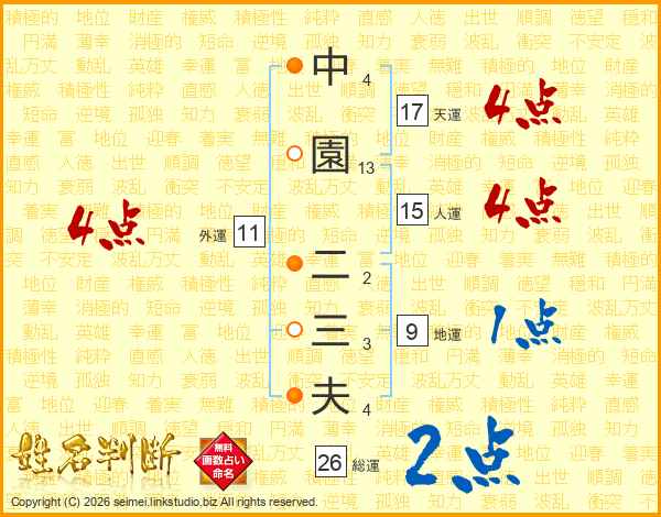 中(4画)園(13画) 二(2画)三(3画)夫(4画)