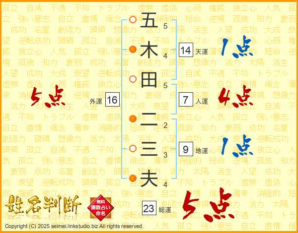 生活面を象徴する運勢です。外部から受ける影響力を表し、結婚運、家庭運や職場、環境への順応性を表します。総運から人運を引いた画数。姓や名が1文字の場合を除く。