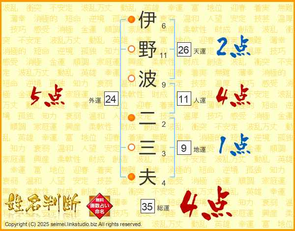 伊(6画)野(11画)波(9画) 二(2画)三(3画)夫(4画)