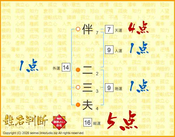 伴二三夫さんの総運は16画の5点!
