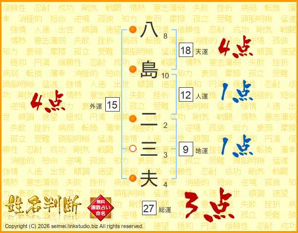 八(8画)島(10画) 二(2画)三(3画)夫(4画)
