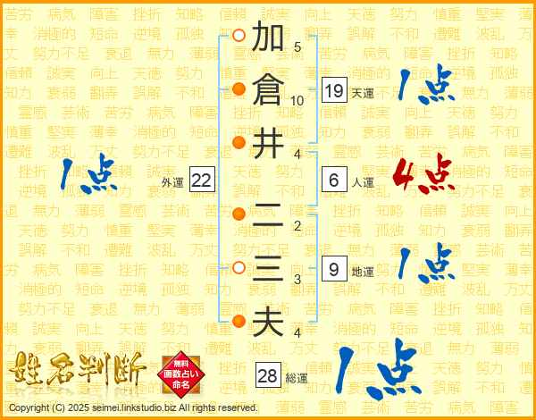 加(5画)倉(10画)井(4画) 二(2画)三(3画)夫(4画)