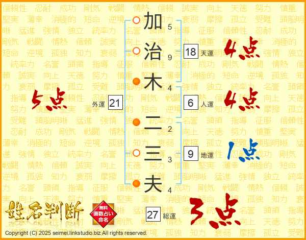 加(5画)治(9画)木(4画) 二(2画)三(3画)夫(4画)