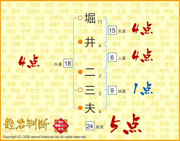 堀(11画)井(4画) 二(2画)三(3画)夫(4画)