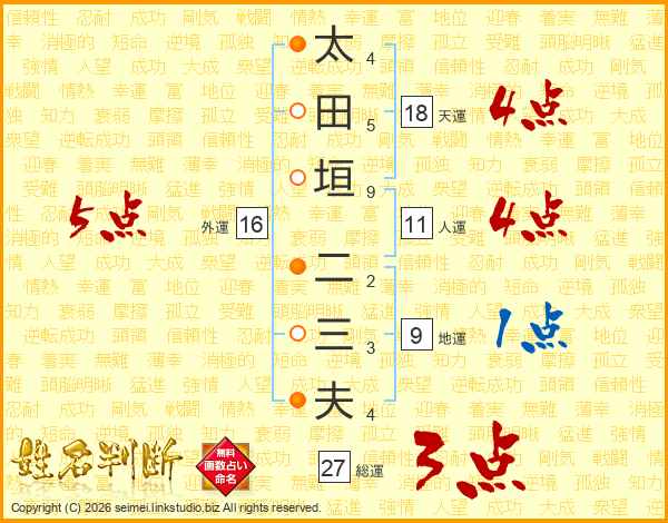 太(4画)田(5画)垣(9画) 二(2画)三(3画)夫(4画)