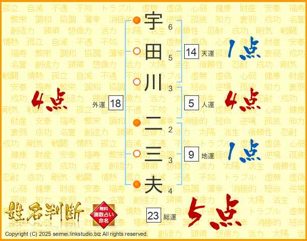 宇(6画)田(5画)川(3画) 二(2画)三(3画)夫(4画)