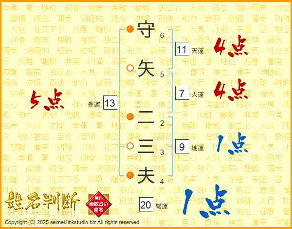 生活面を象徴する運勢です。外部から受ける影響力を表し、結婚運、家庭運や職場、環境への順応性を表します。総運から人運を引いた画数。姓や名が1文字の場合を除く。