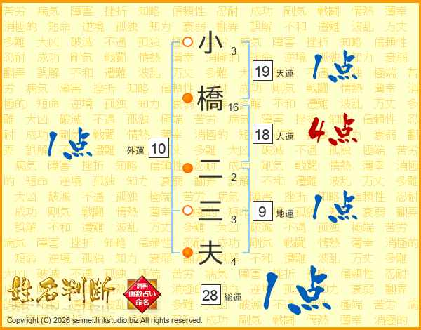 生活面を象徴する運勢です。外部から受ける影響力を表し、結婚運、家庭運や職場、環境への順応性を表します。総運から人運を引いた画数。姓や名が1文字の場合を除く。