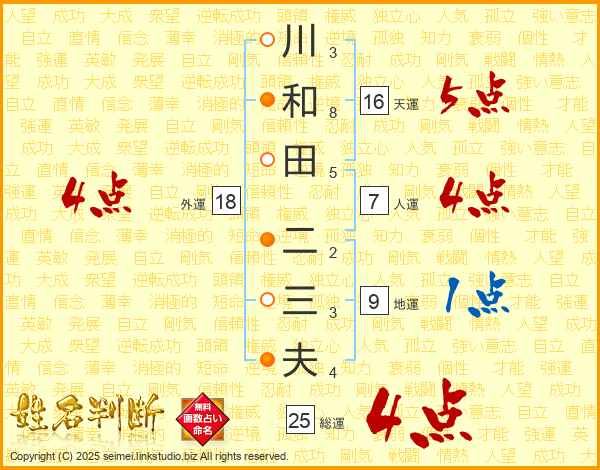 川(3画)和(8画)田(5画) 二(2画)三(3画)夫(4画)
