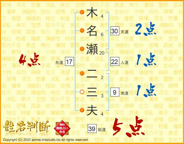 木(4画)名(6画)瀬(20画) 二(2画)三(3画)夫(4画)