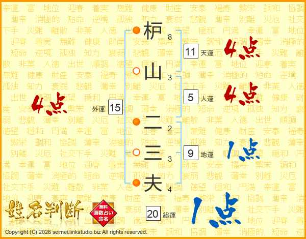 枦(8画)山(3画) 二(2画)三(3画)夫(4画)