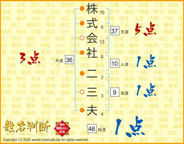 株(10画)式(6画)会(13画)社(8画) 二(2画)三(3画)夫(4画)