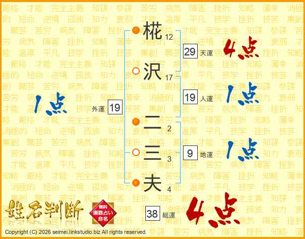 椛沢二三夫さんの総運は38画の4点!