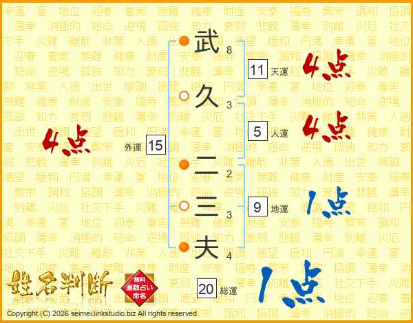 武(8画)久(3画) 二(2画)三(3画)夫(4画)