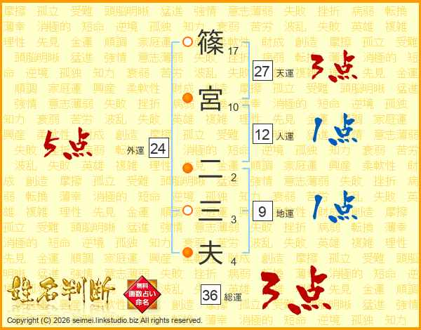 篠(17画)宮(10画) 二(2画)三(3画)夫(4画)