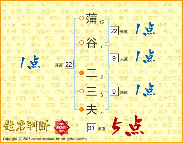 蒲(15画)谷(7画) 二(2画)三(3画)夫(4画)