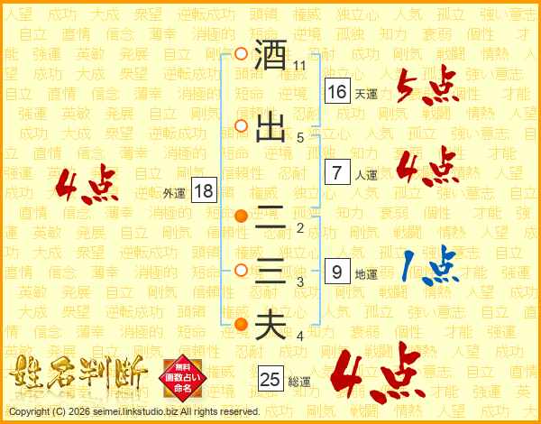 生活面を象徴する運勢です。外部から受ける影響力を表し、結婚運、家庭運や職場、環境への順応性を表します。総運から人運を引いた画数。姓や名が1文字の場合を除く。