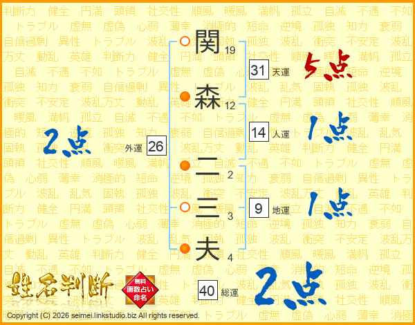 関(19画)森(12画) 二(2画)三(3画)夫(4画)
